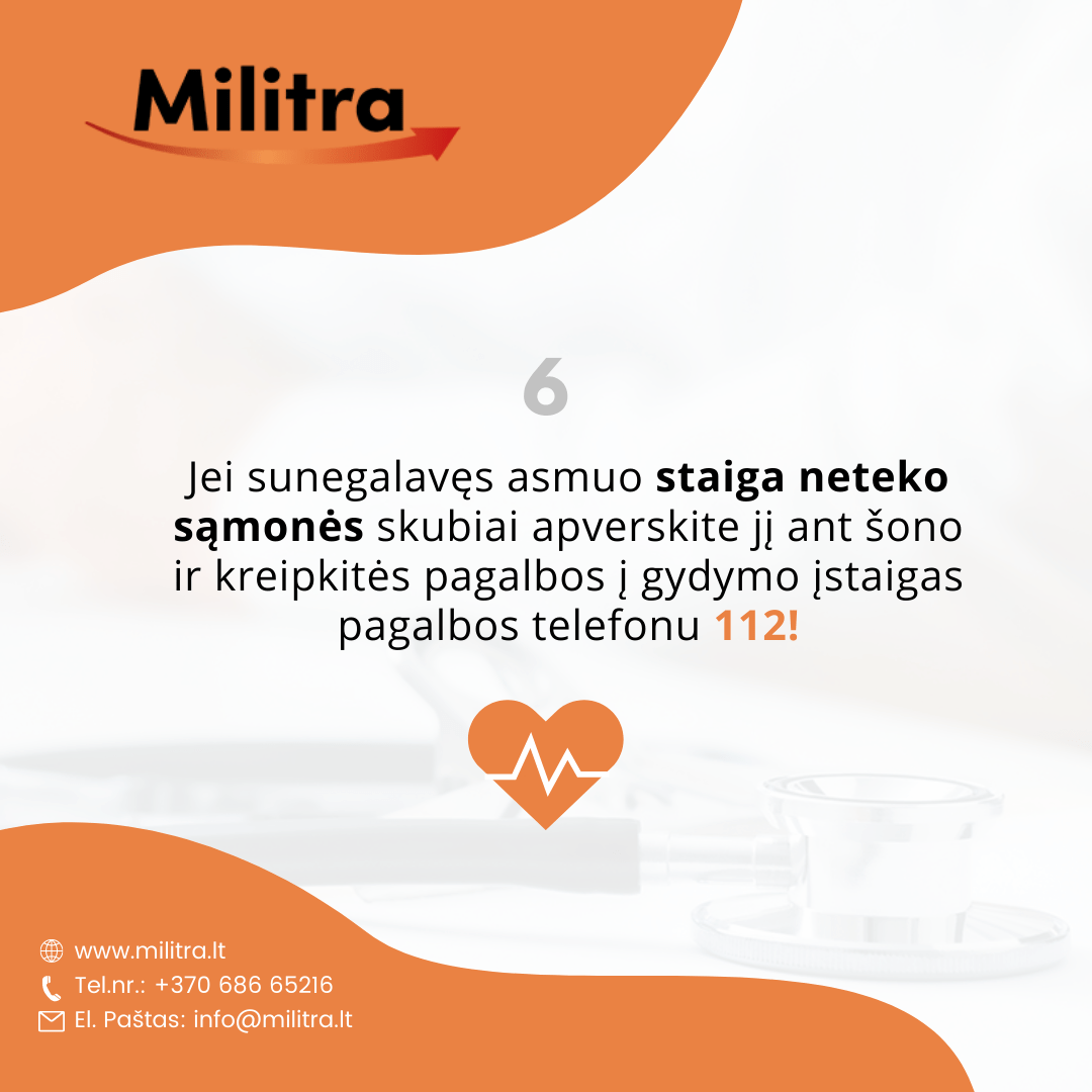 6. Jei sunegalavęs asmuo staiga neteko sąmonės skubiai apverskite jį ant šono ir kreipkitės pagalbos į gydymo įstaigas pagalbos telefonu 112.