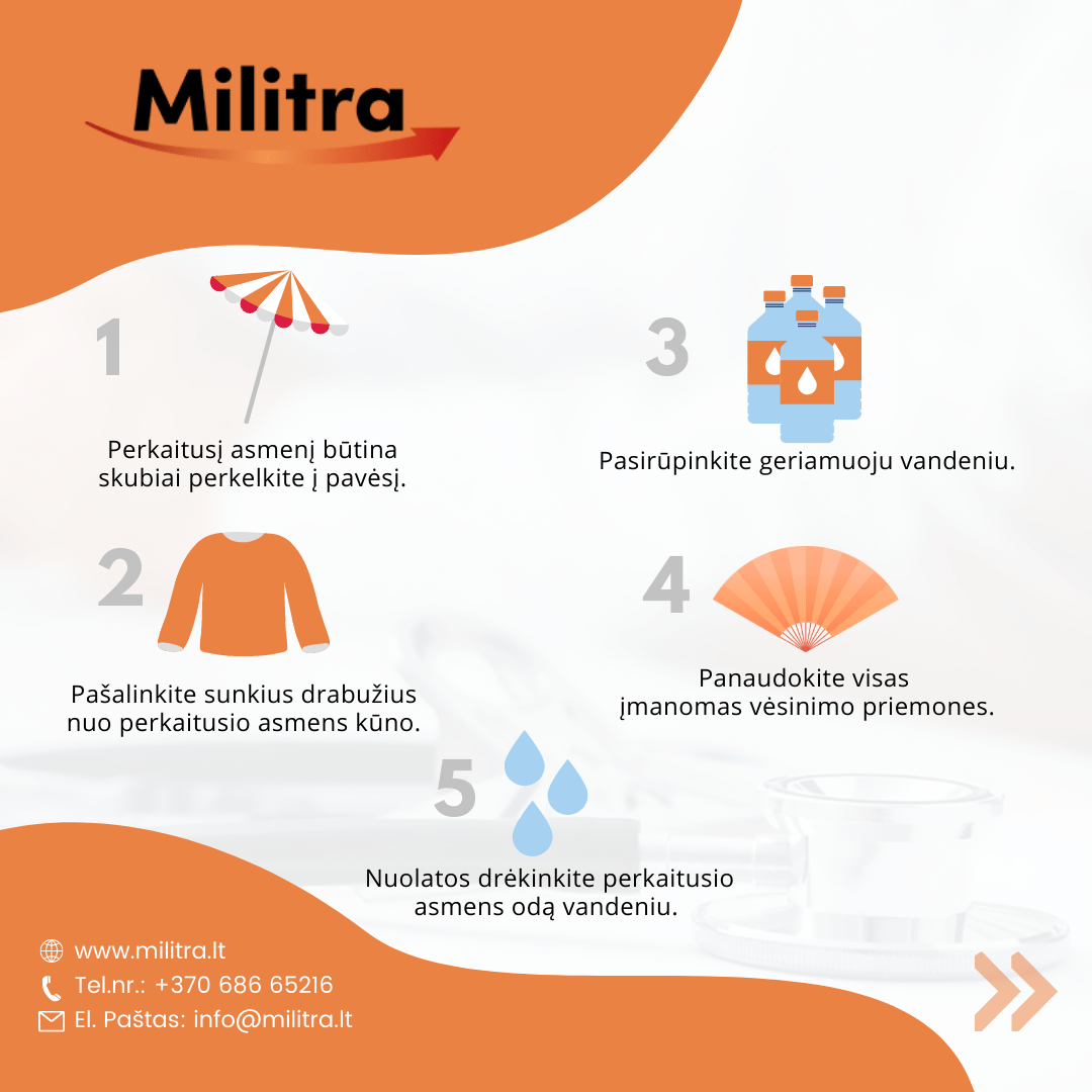 1. Perkaitusį asmenį būtina skubiai perkelti į pavėsį ar kitą vėsią vietą. Sunegalavusį asmenį rekomenduojama paguldyti šiek tiek pakelta galva ir pėdomis.